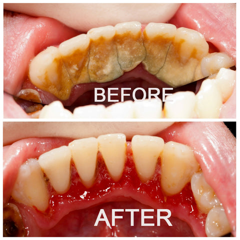 -- Gently removes stains, plaque, and tartar on contact.